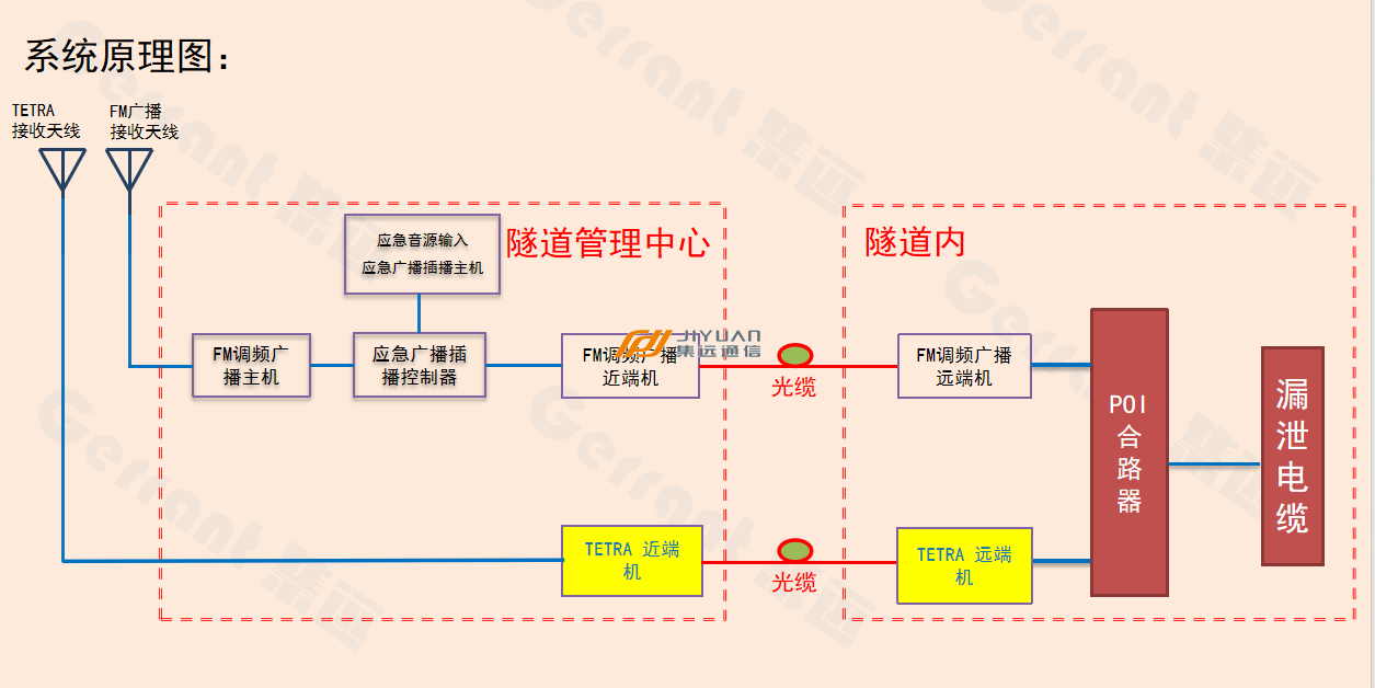 隧道内覆盖系统由FM调频广播系统及TETRA系统的远端机、多系统合同平台POI、射频同轴电缆、功分器、耦合器和漏泄电缆等组成。远端机将近端机传输过来的数字光信号转换成射频信号后再次放大,经放大的信号通过多系统合路平台POI合路成一路,经功分器、耦合器将信号合理分配至隧道内安装的漏泄电缆中,漏泄电缆将信号均匀覆盖到整条隧道内。